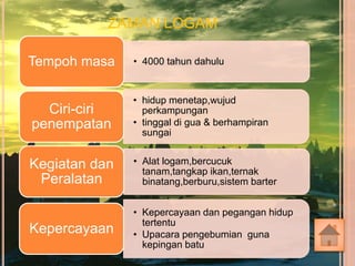 2Evolusi yang berterusan dalam pelbagai aspek kehidupan secara langsung telah memberi kehidupan yang lebih baik dalam masyarakatnya 3Malahan ciri-ciri masyarakat prasejarah yang telah dijelaskan terus berubah. Menjelaskan tentang Zaman Prasejarah di Malaysia 40 ZAMAN PRASEJARAH DI MALAYSIA Negara kita juga tidak terkecuali melalui Zaman Prasejarah. ZAMAN PALEOLITIK - 200 000 300 000 tahun dahulu Tempoh masa Pindah-randah dalam gua.